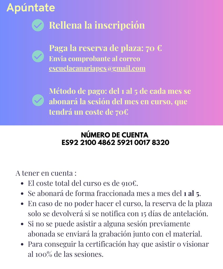 • Modalidad: Formación presencial para quienes residen en Tenerife y online a través de videoconferencia (Zoom). Si alguna sesión no puedes participar, tendrás acceso a la grabación posteriormente.