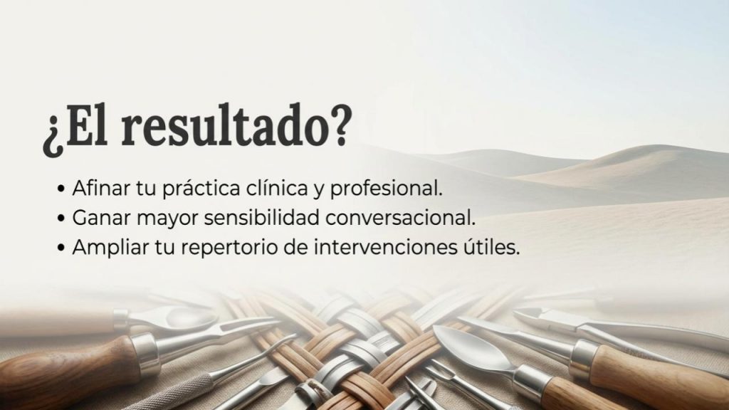 - Práctica directa de destrezas comunicacionales, orientadas a manejar con mayor solvencia los momentos complejos de la conversación terapéutica.