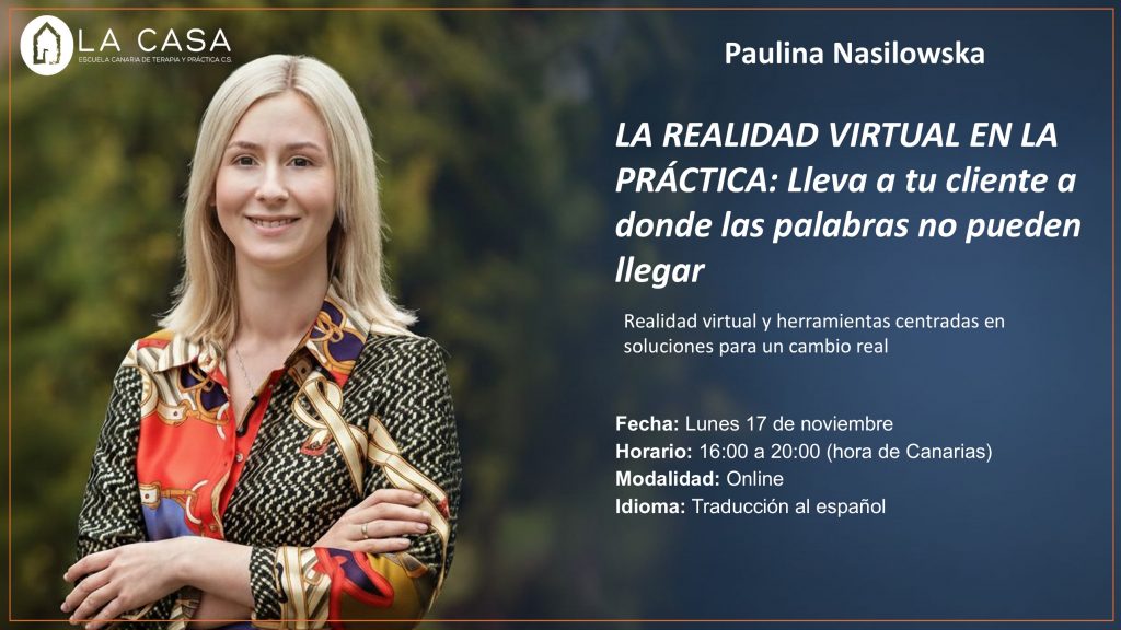 Seminario Internacional con Paulina Nasilowska Lunes 17 de noviembre |… Lee más: LA REALIDAD VIRTUAL EN LA PRÁCTICA. LLEVA A TU CLIENTE DONDE LAS PALABRAS NO PUEDEN LLEGAR - TRAINING AVANZADO EN PRÁCTICA CENTRADA EN SOLUCIONES N-2. Edición 7. Diciembre de 2025